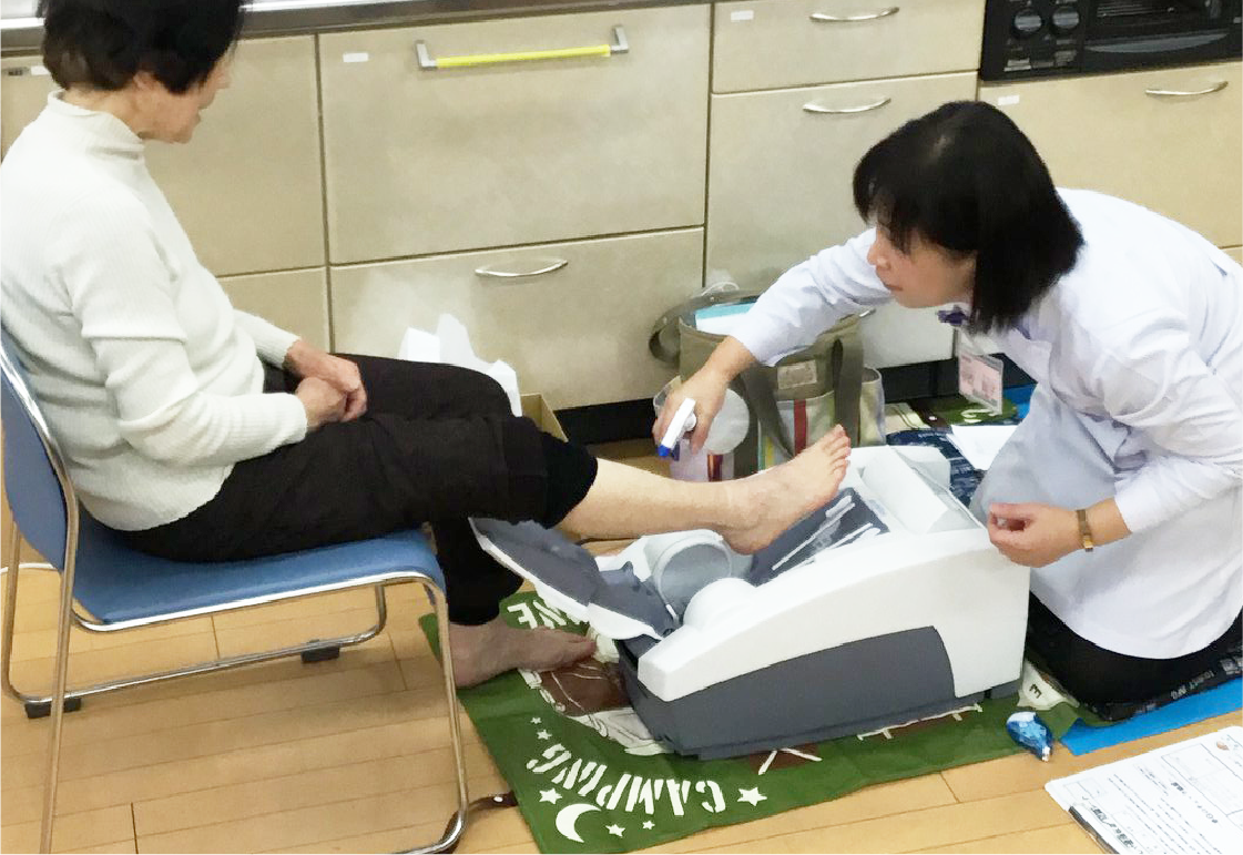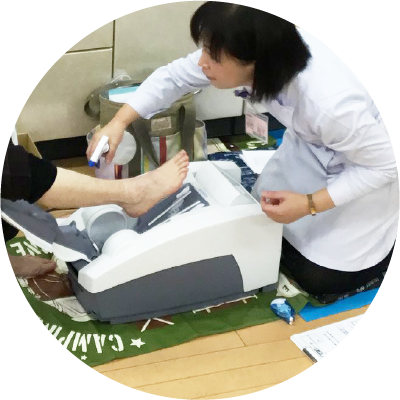 超音波を用いてかかとの骨密度を測定します。素足になっていただき、両くるぶし付近にアルコールを噴霧し、年齢・性別を入力してボタンを押すとゴムが膨らみ、約10秒で測定が完了します。ご年齢と共に低下していくと言われる骨密度、ご自身の状態を知るキッカケにしていただけたらと思っています。