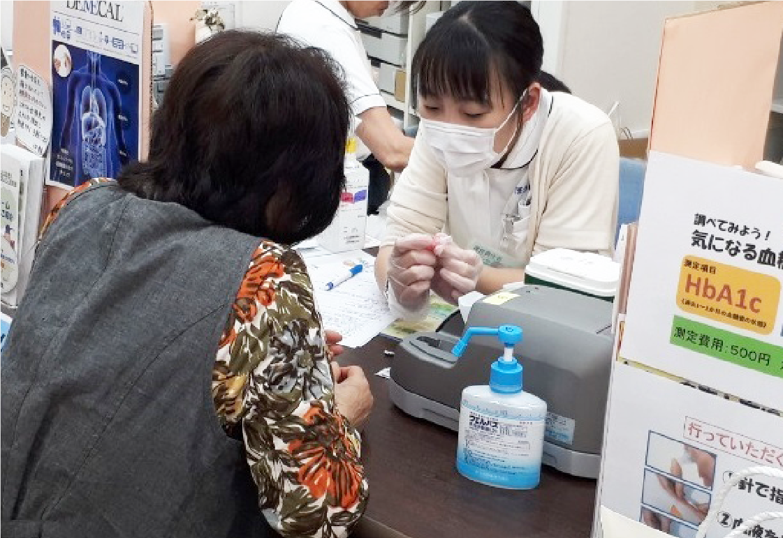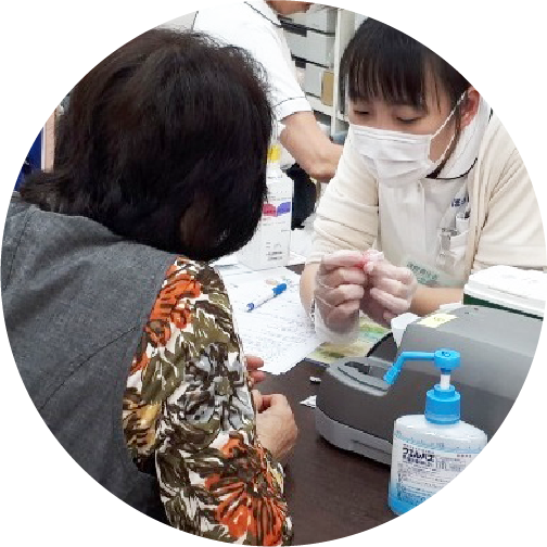 検体測定室ガイドラインに則り、HbA1c・血糖値の測定機会を提供しています。ランセットという細い針で米粒大の血液をご自身で出していただき、小さなスポイトで採取します。機器にセットしたあと約3分で測定が完了します。医療機関受診の動機付けを高める目的で実施しているため糖尿病の患者様は対象外となります。