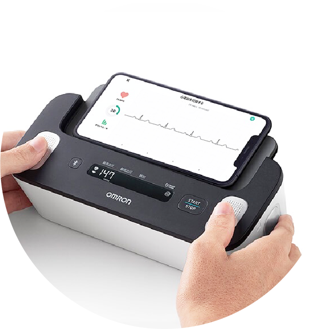 「ご年齢と共に「心房細動」という不整脈にかかるリスクは増加します。ご家庭でも使 用することができるオムロン製の心電計付き上腕式血圧計HCR-7800Tを用いて、血圧だけでなく心臓のリズムを確認することができます。