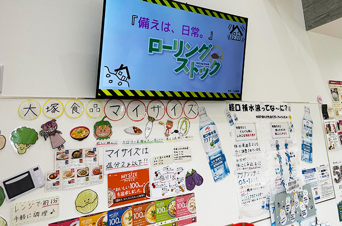 比較的新しい店舗で大きい待合室のため、様々なOTC商品の陳列やPOPにより手に取ってもらいやすい工夫をしています。またデジタルサイネージを使って、ぼうしや薬局の取り組みや役立つ情報を発信しています。